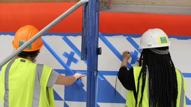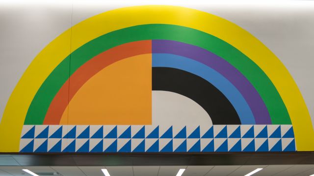 Take To The Water reflects on the significance of Cincinnati and the Ohio River as a beacon of freedom and passage from one phase of life to another. Based on the architectural interiors and structures of Cincinnati and waterways, Gaither explores color, pattern, and the semicircle into a motif of bridges. Each semicircle responds to the tension experienced when traveling, the feelings of excitement, anxiety, and relief in addition to the imagined possibilities/outcomes associated with reaching our destinations. Learn more about the mural and the team behind it here.