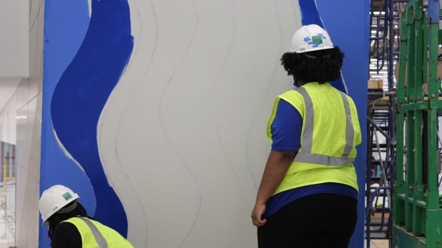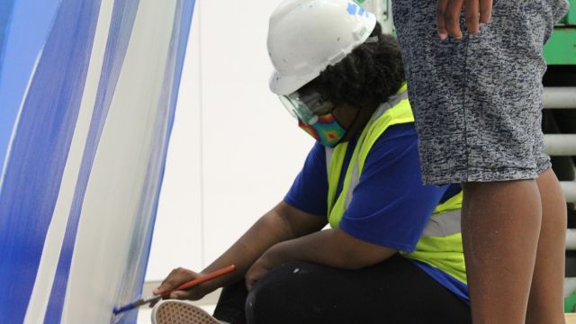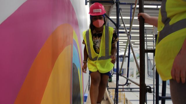 ArtWorks and Cincinnati/Northern Kentucky International Airport (CVG) collaborated in 2021 to create two murals for CVG’s new rental car facility. One of the artists selected to bring vibrancy to this new airport extension was Adrienne Gaither.