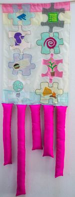 What our Apprentice John (Trey) Easley wrote about the flag design: “With your flag, I knew right off the bat when I heard about your program, I wanted to do. I’m making a baby. So, I started to look up ideas and colors that represent motherhood and the colors I came upon were yellow and pink. I was going to put your logo on the flag but as a first-time sewer I needed something else. Since your logo had yellow in it, I knew I wanted to put yellow in mine as well. I was thinking, what are babies most known for? Off the top of my head I thought their fluffy cheeks. I immediately stuffed the baby’s face with stuffing. As this was the first time for me, I wondered how am I going to sew this up? I hand stitched it! I just want to say thank you for what you are doing. I feel that young moms also get pushed down and I think all they need is help and love. I feel you are making them feel loved. A sincere thanks from myself and everyone at ArtWorks for all that you do to serve our community.”