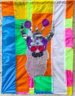 What Our Apprentice LaDe Richardson wrote about the flag design: “I connected with Joanie because I made masks in the summer with ArtWorks for people in the community. If I recall right, we made over 300 masks that summer. I wanted to help out and give back to those who are working during these challenging times. It was a way I could help out and to say thank you. In creating your design, I wanted to touch on the well-made and beautiful fireworks theme found in multiple masks you made. So, I made masks that in my eyes were beautiful and well made. The top orange mask has these plant-like shapes on it, the middle pink mask is a cheetah design, and the last mask is a green mask with yellow shapes in it. They are the main fireworks you see with the other standard firework around them.”