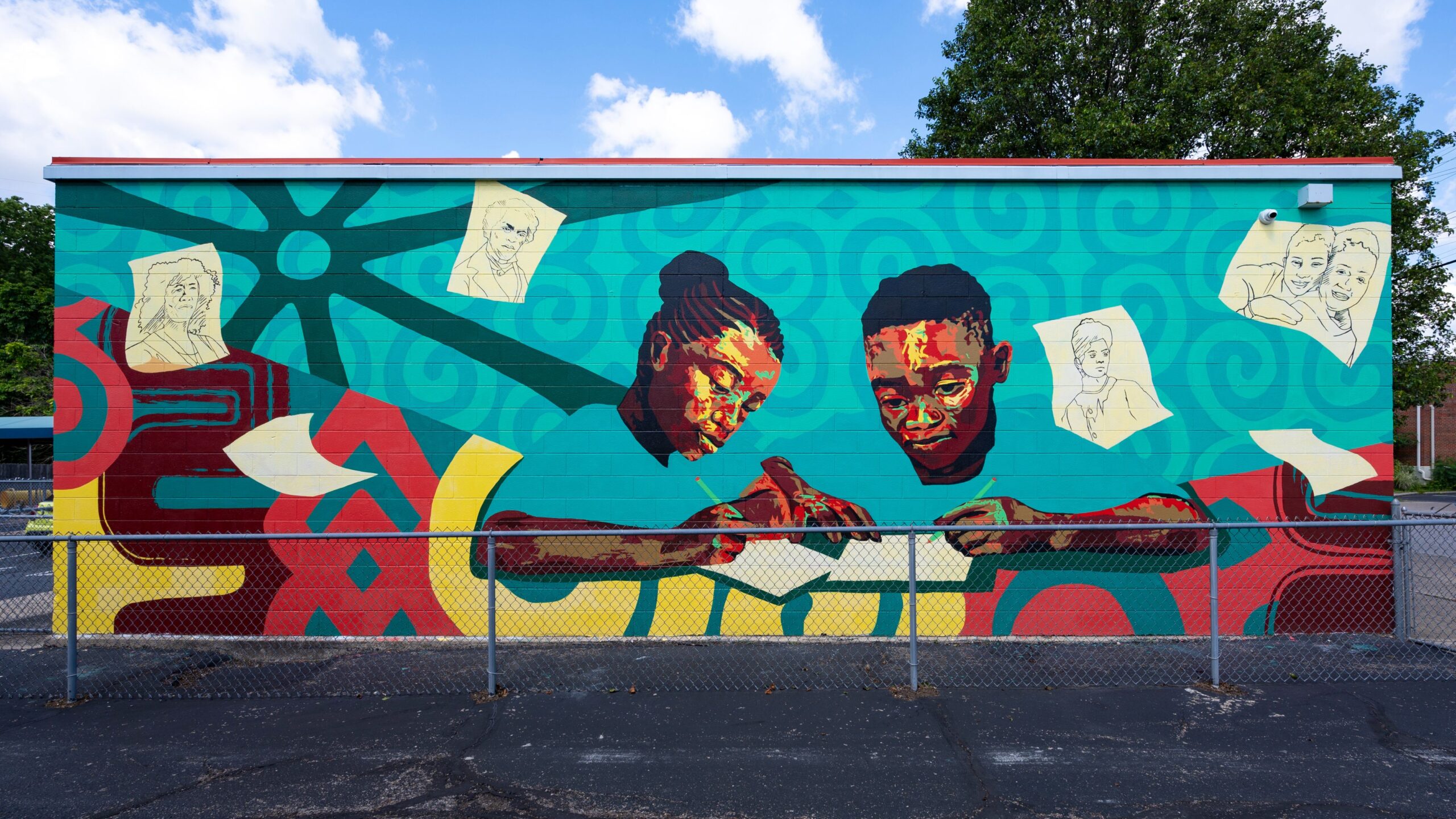 Kiddy Kare Young People’s Liberation School partnered with ArtWorks to produce a mural that speaks to young people’s important role in writing their own futures. This project, designed by Mural Studio Artists Ella Emanuel, Maria Hart, and Miles Brueggemeyer, celebrates how students embody Black history through their work in the classroom. It borrows inspiration from pan-African colors, African textiles, and Adinkra symbols. Throughout the mural, viewers can see two students bursting with creativity, surrounded by images of freedom fighters, historical figures, and KKYPLS’s founders. The ananse ntontan, representing wisdom, bursts from the corner, overarching the design and inspiring a dedication to learning.